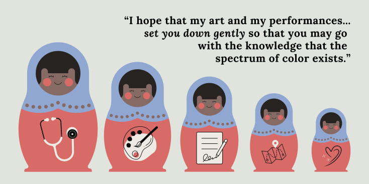 I hope that my art and my performances engage you, wrap you, hold you with rapt interest, and then set you down gently so that you may go with the knowledge that the spectrum of color exists.