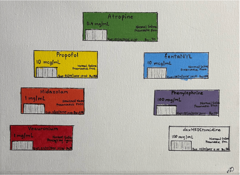 PRIDE and Precedex not only showcase the colors of this safety labeling system but also honor the innovation and history behind its creation. I wanted these colors to symbolize the evolution and diversity within the field of anesthesiology, reflecting the growth that has taken place recently in anesthesiology. As interest in anesthesia grows among medical students, it has been refreshing to see more diversity and inclusions efforts across training programs and professional conferences. As a member of the LGBTQ+ community, I have found great solace and inspiration in connecting with peers and mentors who are equally passionate about advancing queer health and representation in anesthesiology. This piece celebrates a unique intersection of identity and career for me and serves as a reminder of the critical importance of diverse voices in shaping the future of anesthesiology.